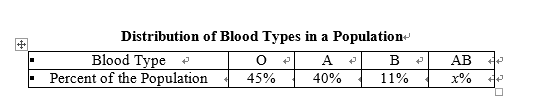 The distribution of blood types within a certain population is shown in the table. What is the probability that a person chosen at random from the population will be a person who has blood type AB?