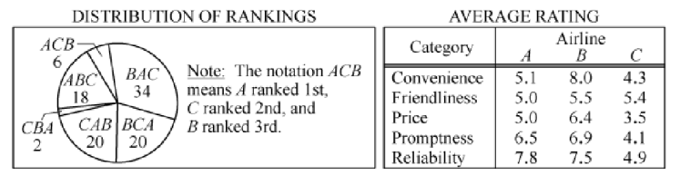 In a survey, 100 travel agents each ranked Airlines A,B and C in order of preference. Each of the 100 travel agents also rated the three airlines in five categories on a scale of 1 through 10, with 10 being the best rating.