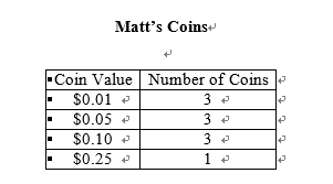 Matt has 10 coins, and their values are shown in the table. If Matt randomly selects 4 of the coins, which of the following could be the total value of the 4 coins?