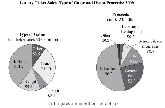 The revenue from lottery ticket sales is divided between prize money and the various uses shown in the graph labeled "Proceeds." In 2009, what percent of the money spent on tickets was returned to the purchasers in the form of prize money?