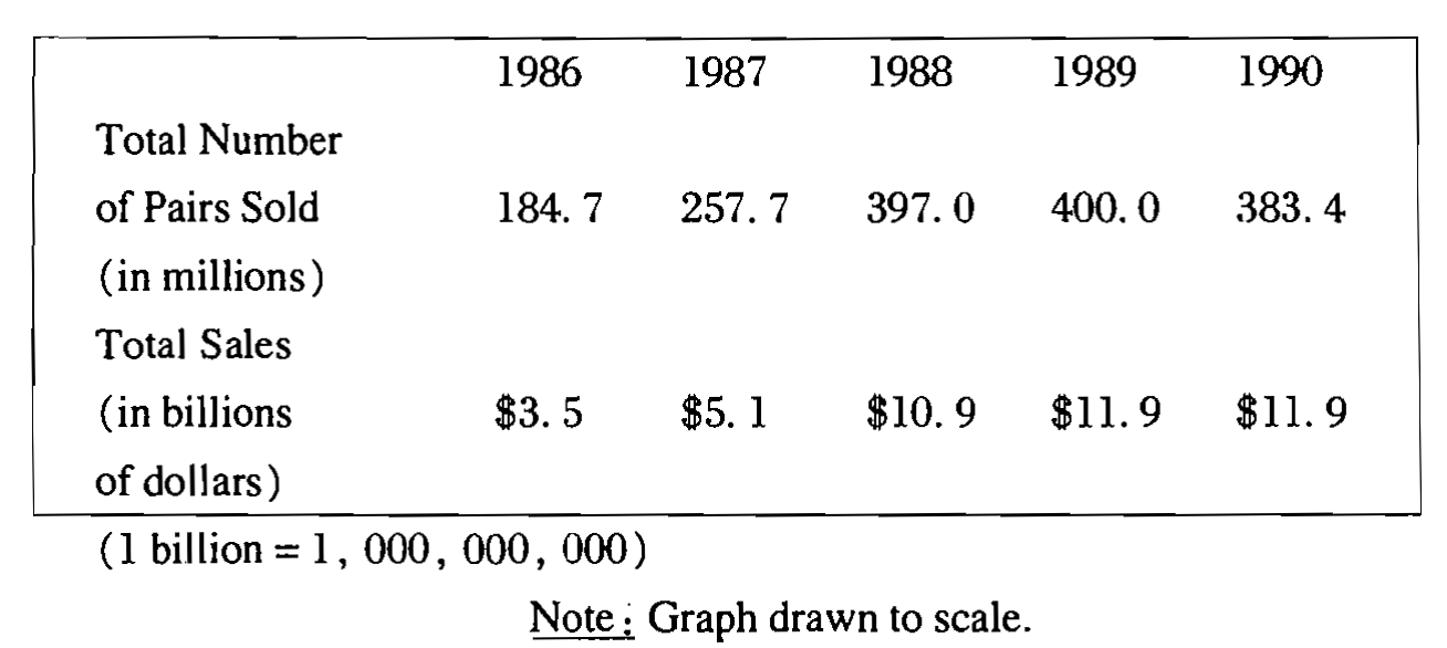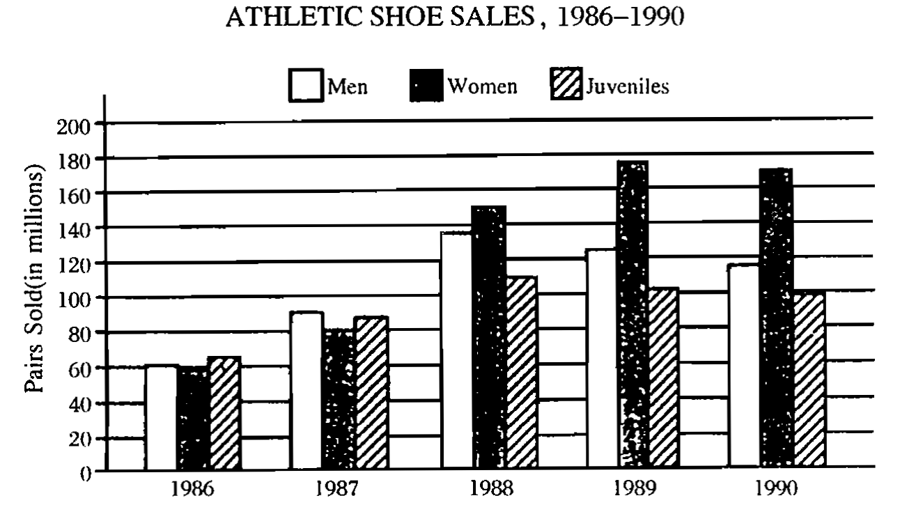 For how many of the year shown was the number of pairs of women`s athletic shoes sold more than half the combined number of pairs of men`s and juveniles` athletic shoes sold?